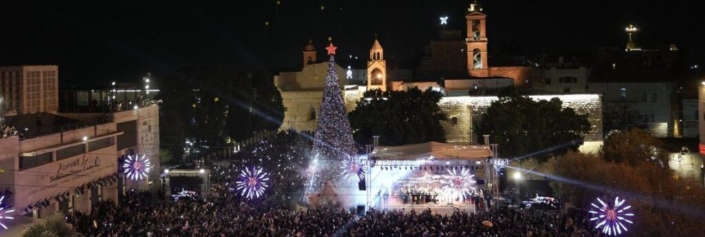 On a recent Saturday, crowds lined with heavily armed police cheered following a prayer calling for peace, and fathers hoisted children onto their shoulders as a towering Christmas tree lit up Manger Square, near the site where Christians believe Jesus was born.